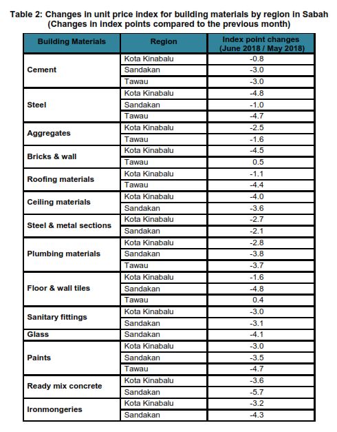 The changes in the unit price indices for building materials by region in Sabah are shown in Table 2.