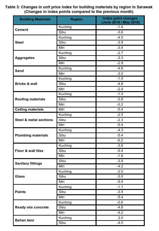The changes in the unit price indices for building materials by region in Sarawak are in Table 3.