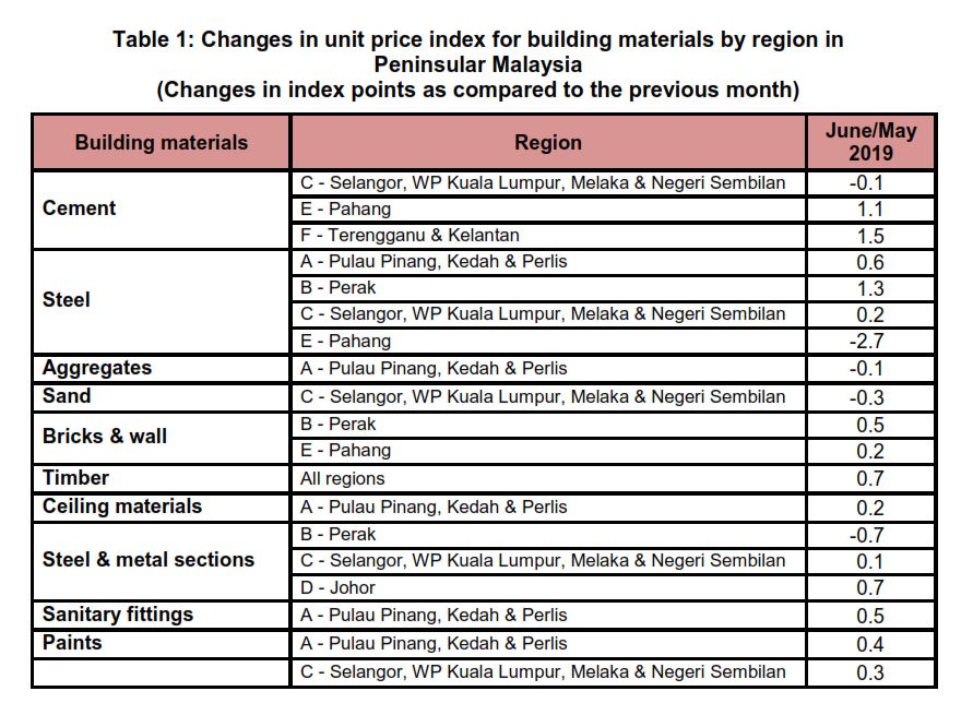 The Building Material Cost Index (BCI) (without steel bars and with steel bars) for almost all categories of building in all regions increased between 0.1 and 0.8 per cent in June 2019 as compared to the previous month. However, the BCI (without steel bars) in region B (Perak) for Single storey (R.C.) building, 2-4 storey (R.C.) building (flat roof) and 5 storey and above (R.C.) building (for office) decreased 0.1 per cent respectively as compared to the previous month. Meanwhile, BCI (with steel bars) in region E (Pahang) for almost all categories of building decreased between 0.1 and 1.1 per cent except Timber building (0.6 per cent) and (R.C) piling (0.7 per cent).
