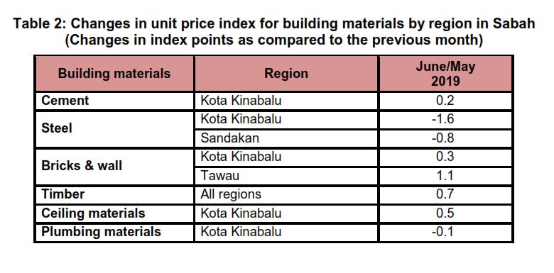The Building Material Cost Index (BCI) (without steel bars) for all categories of building in Kota Kinabalu, Sandakan and Tawau increased between 0.1 and 0.7 per cent in June 2019 as compared to the previous month.