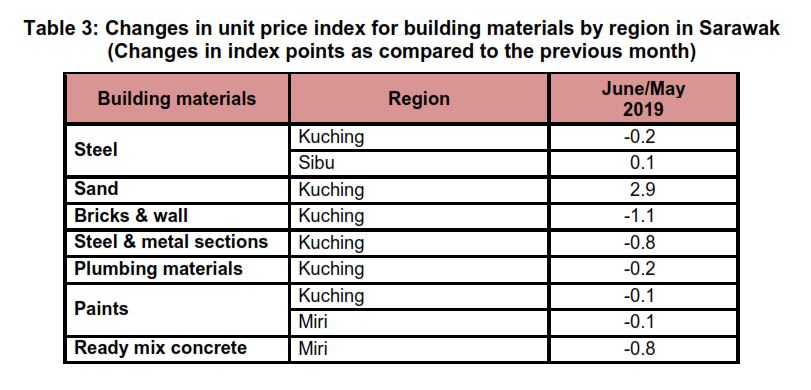 The Building Material Cost Index (BCI) (without steel bars and with steel bars) for all categories of building in Kuching and Miri decreased between 0.1 and 0.6 per cent in June 2019. While, the BCI (with steel bars) in Sibu for Single storey (R.C.) building, 5 storey and above building (for accommodation) and (R.C.) Piling increased by 0.1 per cent as compared to the previous month.