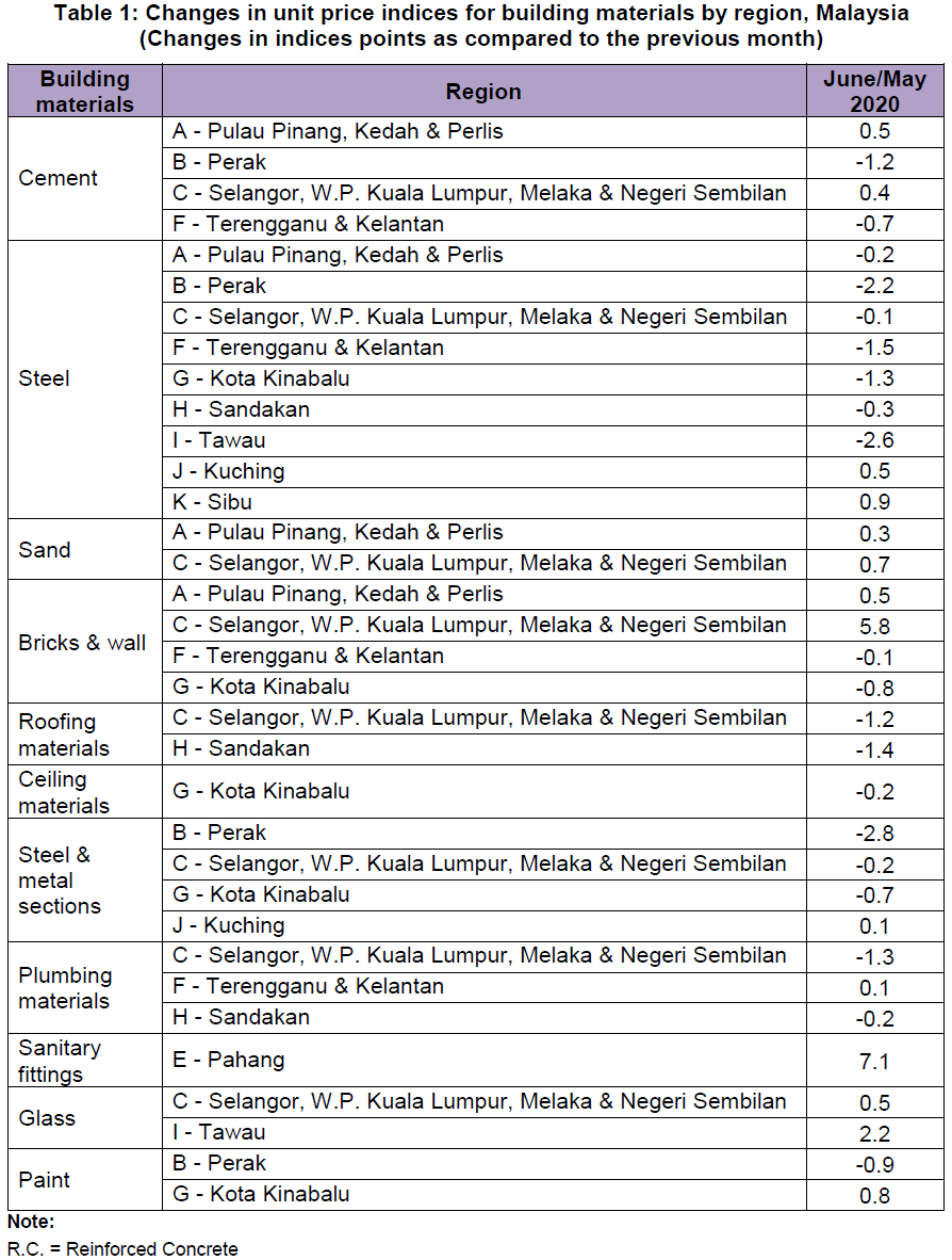 The changes in unit price indices of building materials by region in Malaysia are shown in Table 1.