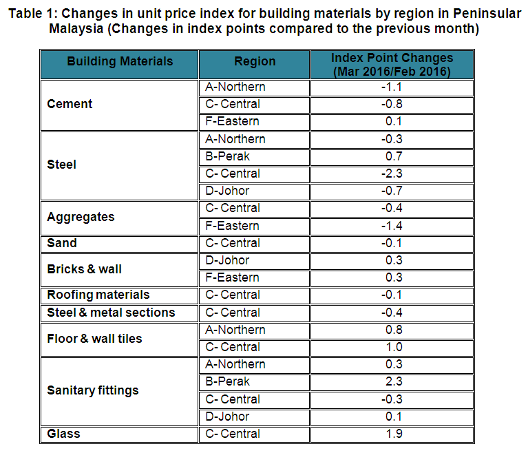 The Building Material Cost Index (BCI) (without steel bars and with steel bars) for almost all regions showed changes except for region E (Pahang) which stated unchanged in March 2016 as compared to the previous month.