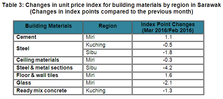The Building Material Cost Index (BCI) (without steel bars and with steel bars) for all building categories in Kuching and Sibu showed decreases in March 2016 as compared to the previous month. Meanwhile, the BCI (without steel bars) for 2-4 storey (R.C.) building (pitched roof) in Miri showed an increase of 0.1 per cent in March 2016 as compared to February 2016.