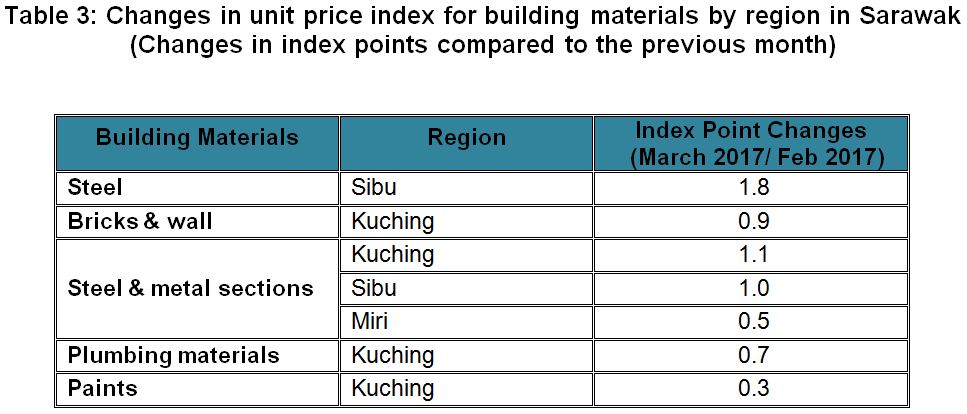The BCI (with steel bars) for almost all categories of building in Kota Kinabalu and Tawau showed increases in March 2017. While, the BCI in Sandakan remained unchanged as compared to the previous month.