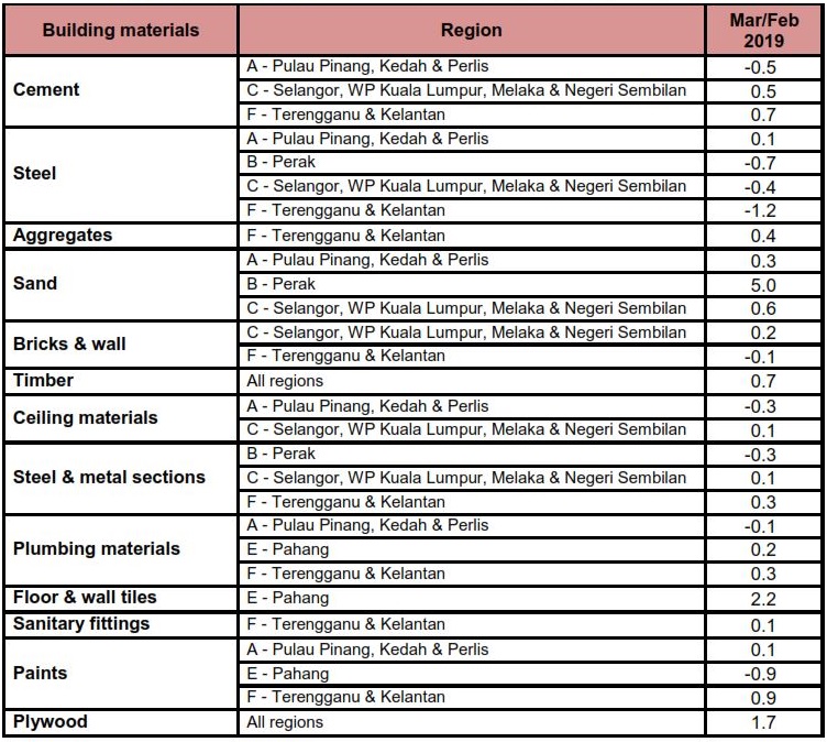 Table 1: Changes in unit price index for building materials by region in Peninsular Malaysia