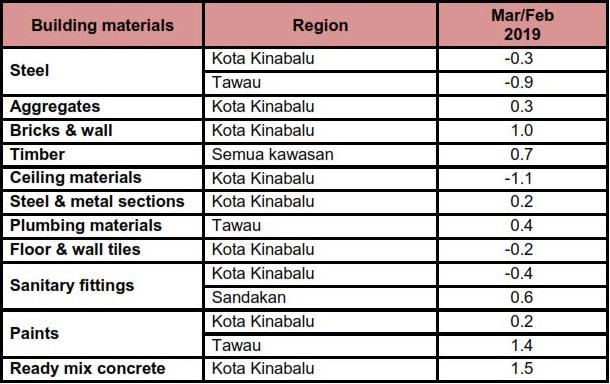 The Building Material Cost Index (BCI) (without steel bars and with steel bars) for all categories of building in Kota Kinabalu, Sandakan and Tawau increased between 0.1 and 1.1 per cent in March 2019 as compared to the previous month except the BCI (with steel bars) for 5 storey & above (R.C.) building (for office) and (R.C.) Piling in Tawau decreased by 0.1 and 0.5 per cent respectively.
