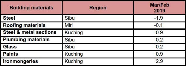 Table 3: Changes in unit price index for building materials by region in Sarawak