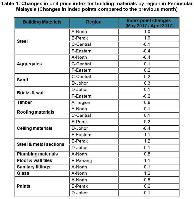 The Building Material Cost Index (without steel bars and with steel bars) for almost all categories of buildings in Peninsular Malaysia increased in May 2017 as compared to April 2017