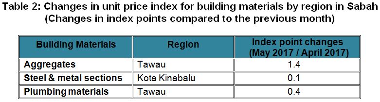 The Building Material Cost Index (BCI) (without steel bars) in Tawau recorded an increase of 0.1 per cent for single storey (R.C.) building and 2-4 storey (R.C.) building (pitched roof) in May 2017. While, the BCI for Kota Kinabalu and Sandakan remained unchange as compared to the previous month.