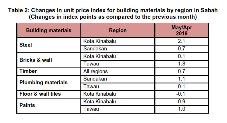 The Building Material Cost Index (BCI) (without steel bars) for all categories of building in Kota Kinabalu, Sandakan and Tawau increased between 0.1 and 0.7 per cent in May 2019 as compared to the previous month.