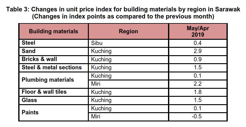 The Building Material Cost Index (BCI) (without steel bars) for all categories of building in Kuching increased between 0.2 and 0.7 per cent in May 2019 as compared to the previous month. In Miri, only the BCI for Single storey steel frame (building) showed a change of 0.1 per cent as compared to April 2019. While, the BCI for all categories of building in Sibu remained unchanged as compared to the previous month.