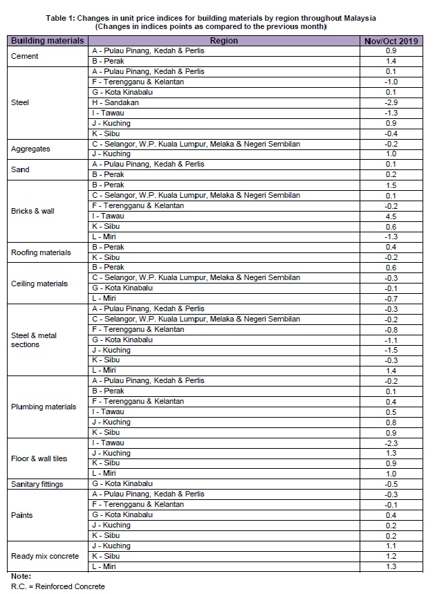 The changes in unit price indices of building materials by region throughout Malaysia are shown in Table 1.