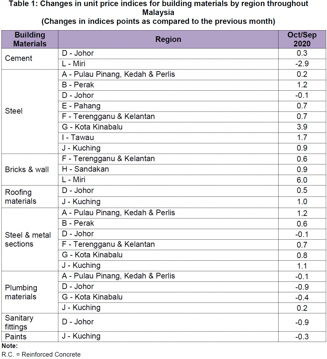 The BCI in Peninsular Malaysia for region A (Pulau Pinang, Kedah & Perlis), B (Perak), E (Pahang) and F (Terengganu & Kelantan) increased between 0.1 and 0.6 per cent for almost all categories of building. The BCI in region D (Johor) increased 0.1 per cent for (R.C.) Piling only. The BCI in region C (Selangor, W.P. Kuala Lumpur, Melaka & Negeri Sembilan) remained unchanged as in the previous month.