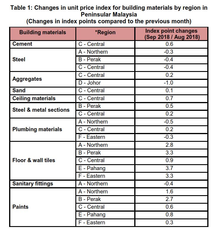 The BCI (with steel bars) in all regions except in region D-Johor showed changes in between -0.1 and 0.3 per cent for several categories of building in September as compared to the previous month. However, the BCI for timber building and timber piling in all regions remained unchange as compared to the previous month.