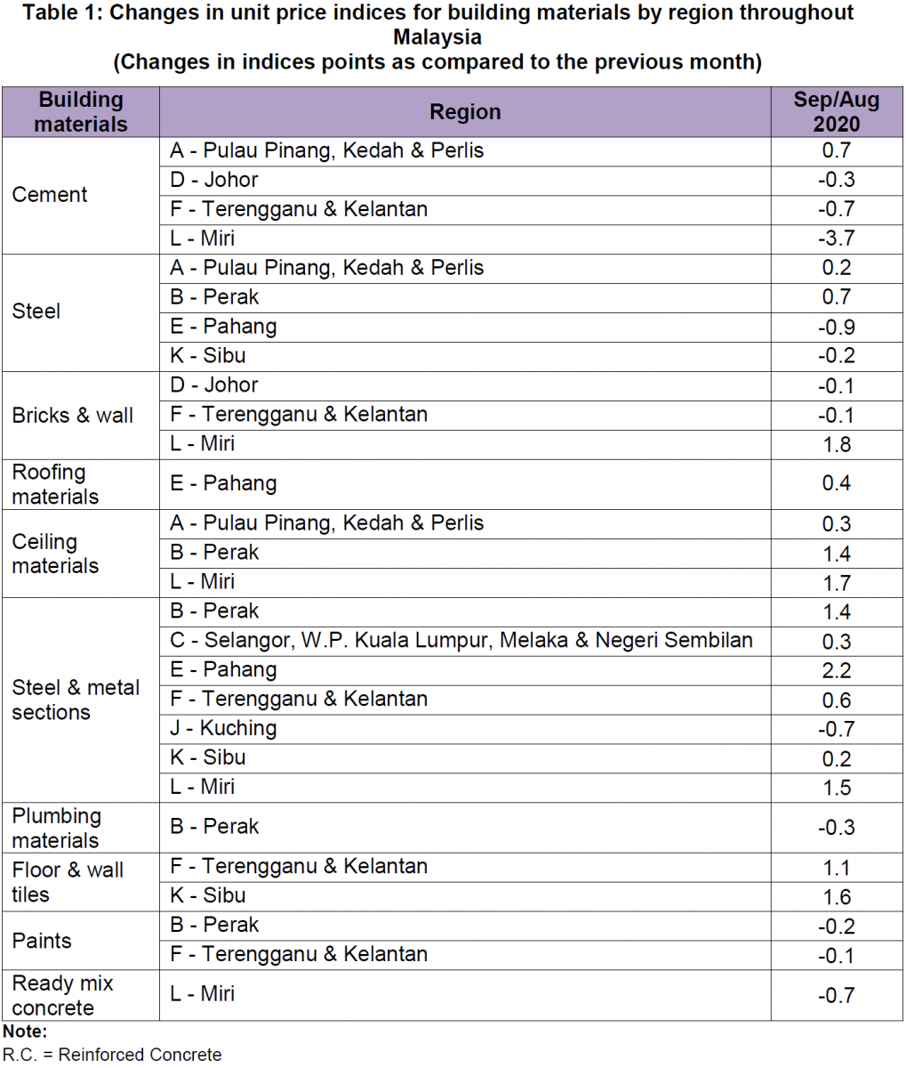The changes in unit price indices of building materials by region throughout Malaysia are shown in Table 1.