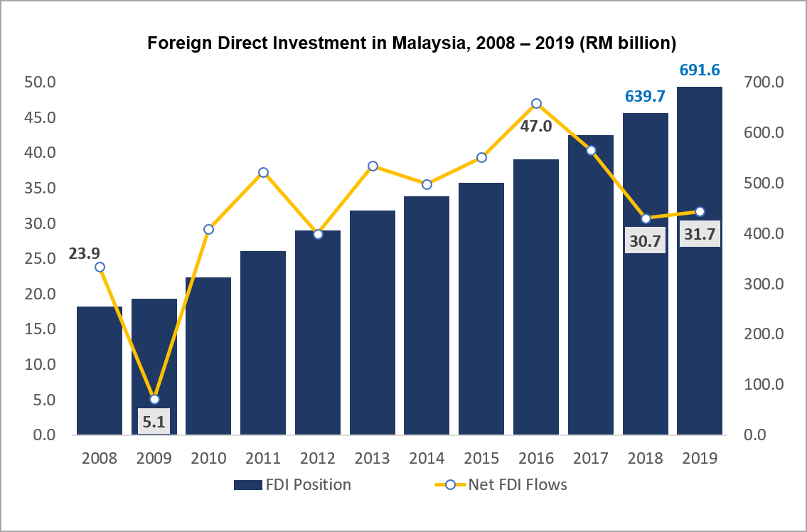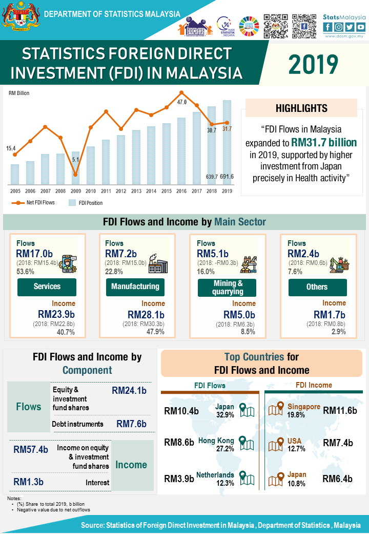 Foreign Direct Investment (FDI) flows in Malaysia expanded to RM31.7 billion in 2019 as compared to RM30.7 billion in the previous year, an increase of 3.1 per cent due to higher injection of equity from Japan precisely in health activity. In terms of position, FDI surged to RM691.6 billion as at end of December 2019 (2018: RM639.7 billion). Meanwhile, investment income decreased to RM58.7 billion from RM60.2 billion in 2018.