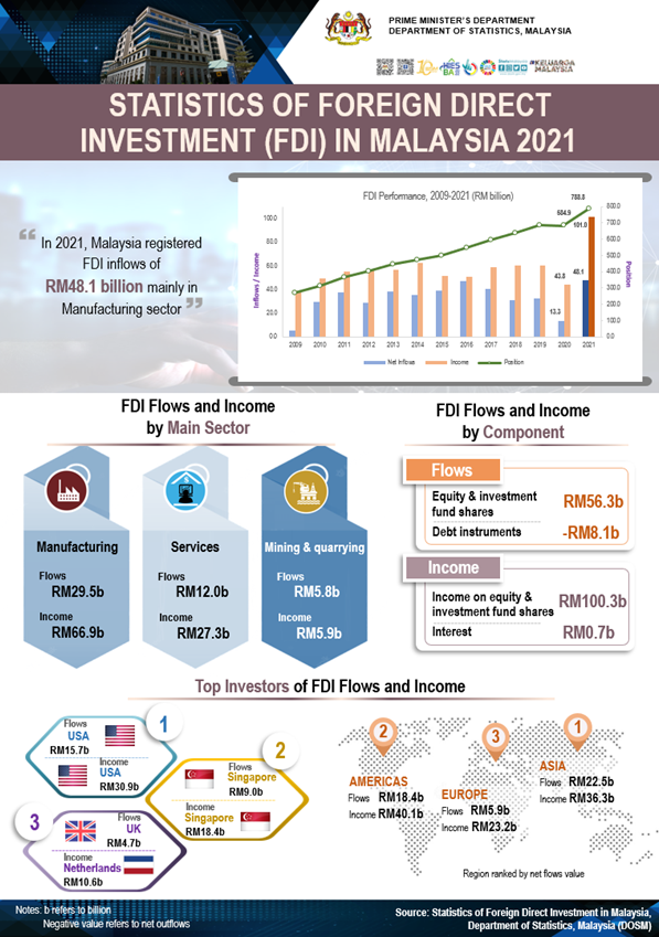 The FDI position stood at RM788.8 billion as at end of 2021, whereby Services was the largest contributor precisely in Financial & insurance/takaful and Wholesale & retail trade activities. This was followed Manufacturing sector with Electrical, transport equipment and other manufacturing as the main subsector. Singapore, Hong Kong and Japan remained as the largest investor country for FDI position.