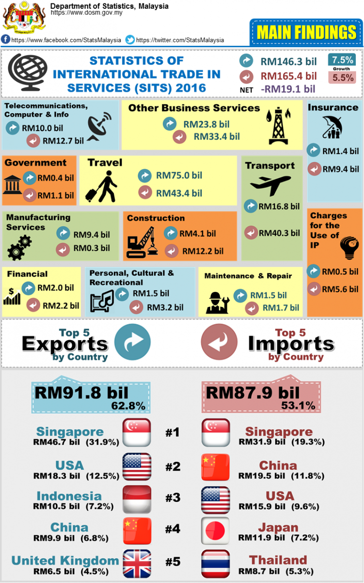 Top five countries contributed to the exports of services were Singapore, USA, Indonesia, China and United Kingdom. As for imports, the major trading partners were mainly from Singapore, China, USA, Japan and Thailand.