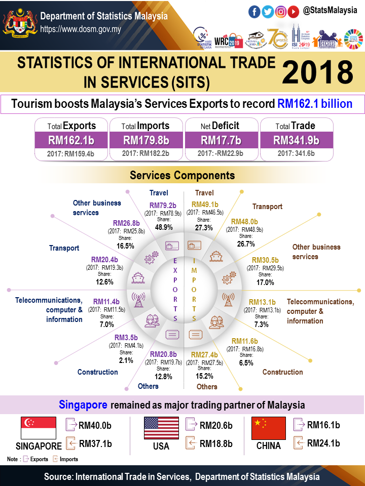 Singapore remained as the most important destination for Malaysia’s exports by registering RM40.0 billion in 2018, primarily from tourism expenditure and other business services. Other major export markets were United States of America (USA) and China with RM20.6 billion and RM16.1 billion respectively. USA remained as the leading markets for exports of manufacturing services while China was for tourism expenditure.