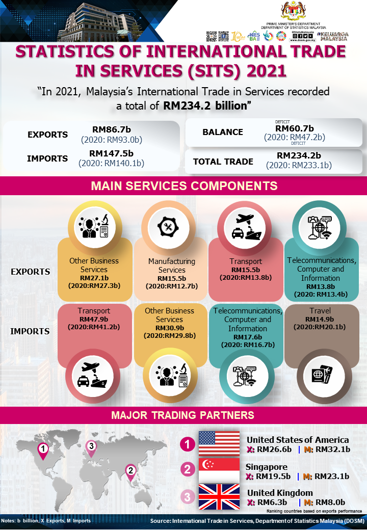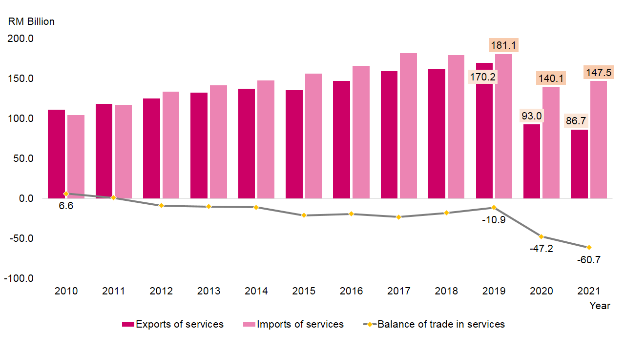 Malaysia’s services trade recorded a deficit of RM60.7 billion owing to lower inbound Travel in 2021