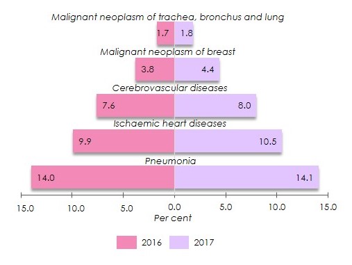 In 2017, the per cent of deaths caused by Ischaemic heart diseases was 13.9 per cent, followed by Pneumonia (12.7%), Cerebrovascular diseases (7.1%), Transport accidents (4.6%) and Malignant neoplasm of trachea, bronchus and lung (2.3%).