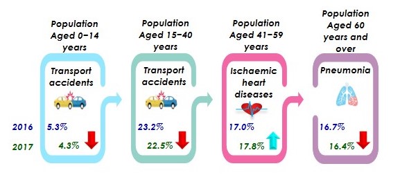 Transport accidents was the principal causes of death for population aged 15−40 years in 2017. The percentage of deaths caused by Transport accidents in 2017 was 22.5 per cent, declined 0.7 percentage points as compared to 2016.