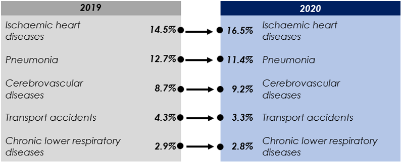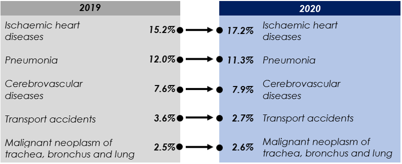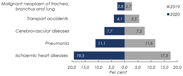 Ischaemic heart diseases remained as the principal causes of death, 17.0 per cent of the 109,155 medically certified deaths in 2020. This was followed by Pneumonia (11.4%), Cerebrovascular diseases (8.3%), Transport accidents (2.9%) and Malignant neoplasm of trachea, bronchus and lung (2.5%).