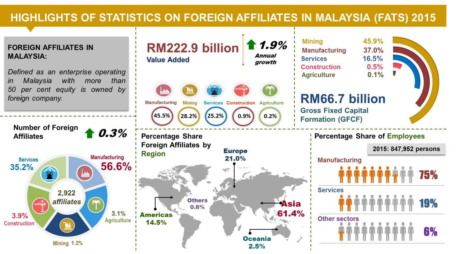 Malaysia’s recorded 2,922 foreign affiliates in 2015, an increase of 0.3 per cent from 2014. Manufacturing sector registered the largest share of 56.6 per cent followed by services sector (35.2%). Value added grew by 1.9 per cent with a value of RM222.9 billion. Manufacturing sector remained as the main contributor with a share of 45.5 per cent, followed by Mining sector (28.2%).