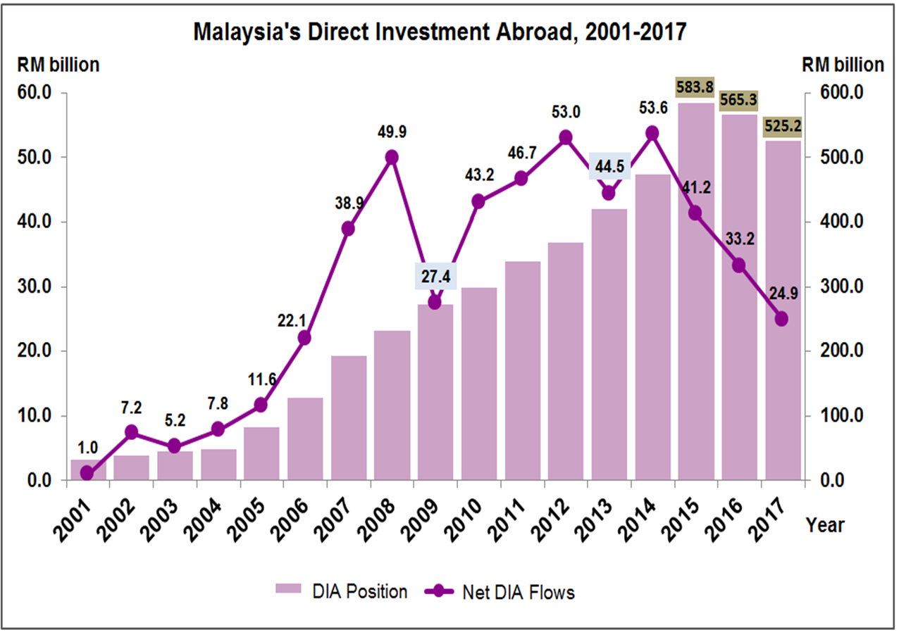 DIA position has been in the increasing momentum since 2001. However, since 2016 the position has been on the downward trend, due to lower DIA flows and stood at RM525.2 billion in 2017.