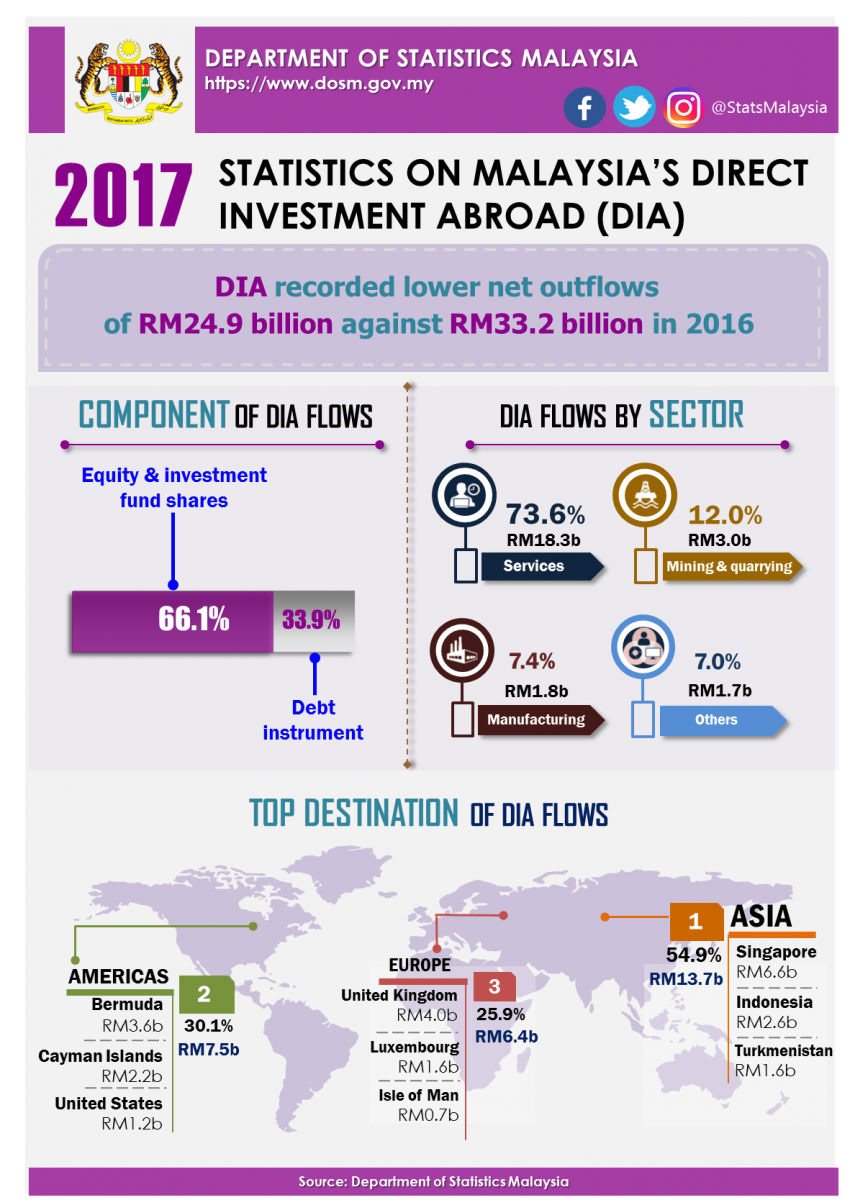 For 2017, Malaysia registered lower net DIA flows of RM24.9 billion as against RM33.2 billion in the previous year. Investment abroad in 2017 was channelled mainly in Services, Mining & quarrying and Manufacturing sectors. Investment in Services sector was primarily in Financial and insurance / takaful; and Real estate activities. In terms of region, Asia was the top destination for Malaysia's DIA flows, contributed half of the investment with RM13.7 billion, followed by Americas and Europe. For Asia region, net DIA flows were mainly to Singapore and Indonesia, while Turkmenistan replaced India as the third largest destination.