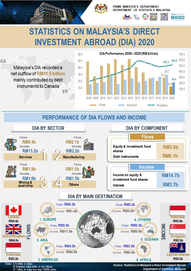The full publication of the Statistics on Malaysia's Direct Investment Abroad (DIA) 2020 can be downloaded through eStatistik portal.