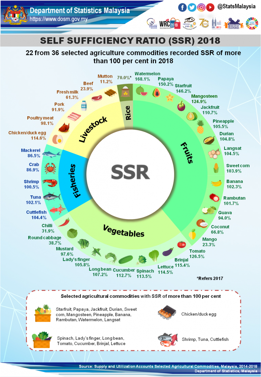Selected agricultural commodities are divided into three categories namely crops (fruits and vegetables), livestock and fisheries. In 2018, a total of 36 agricultural commodities were covered and 22 of them recorded self-sufficiency ratio (SSR) more than 100 per cent.