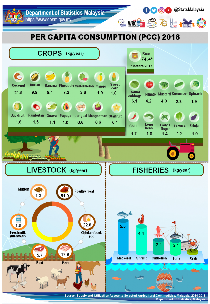 Supply of eleven fruits in 2018 was sufficient to fulfill the local demands with SSR of more than 100 per cent. Watermelon recorded the highest SSR (168.1%) followed by papaya (150.2%) and starfruit (146.2%). Per capita consumption (PCC) of coconut was the highest with consumption of 21.5 kilogrammes per year followed by durian (9.8 kg/year) and banana (9.4 kg/year).