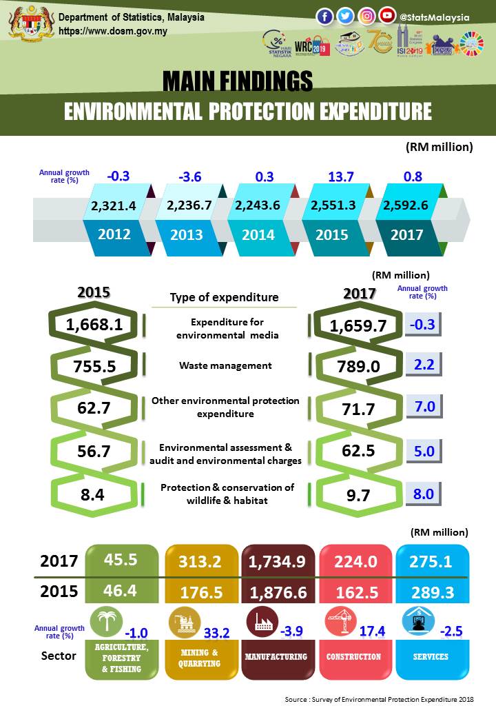 Environmental protection expenditure performance for the year 2017 registered an annual growth rate of 0.8 per cent to RM2.59 billion as compared to 2015. Operating expenditure was the highest contributor of 72.3 per cent meanwhile 27.7 per cent for capital expenditure.