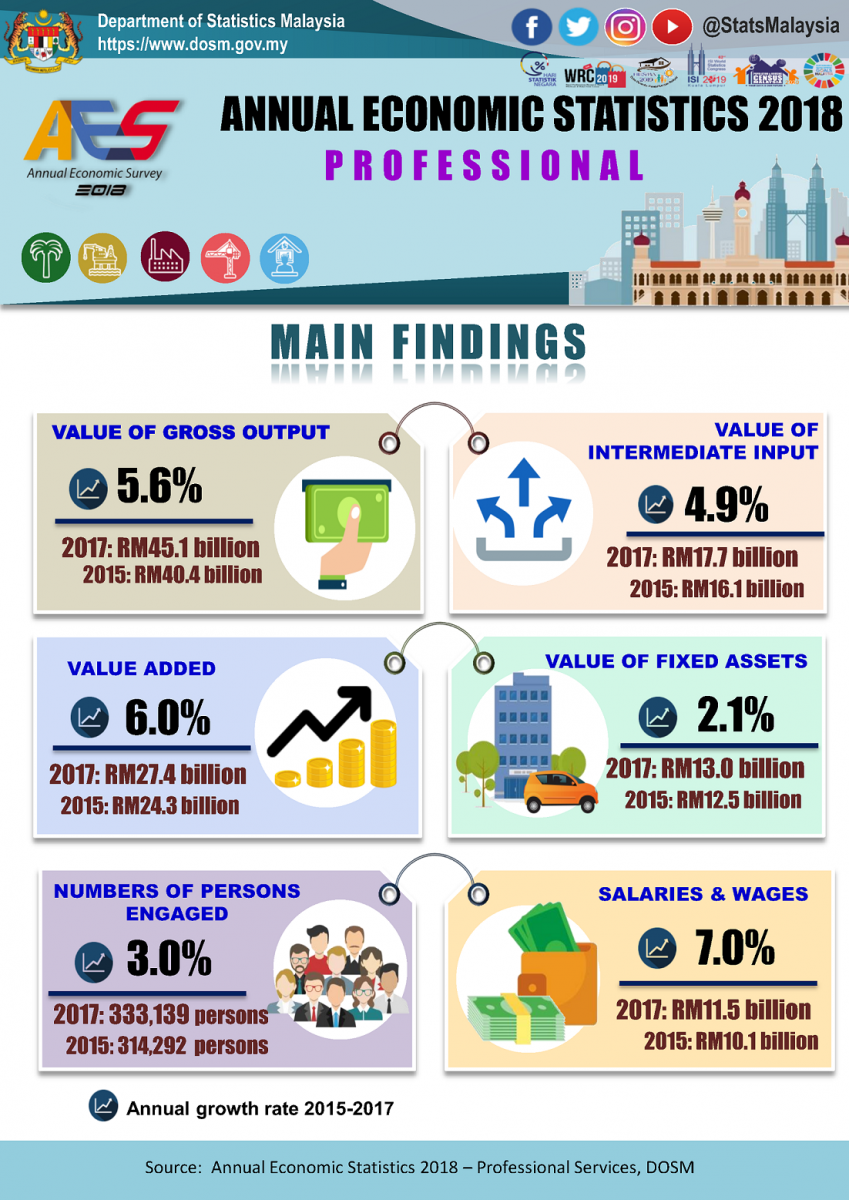 This publication presents statistics on the professional services which obtained from the Annual Economic Survey 2018 for reference year 2017. Professional services comprises activities of architectural; engineering; land & quantity surveying; accounting; legal; advertising; management consultancy and market research; veterinary; scientific research & development and technical testing & analysis; and other professional. The main statistics such as the value of gross output, value of intermediate input, value added, number of persons engaged, salaries & wages paid as well as value of fixed assets owned is also presented in this publication.