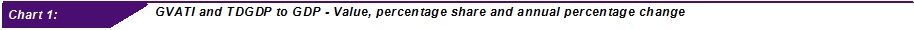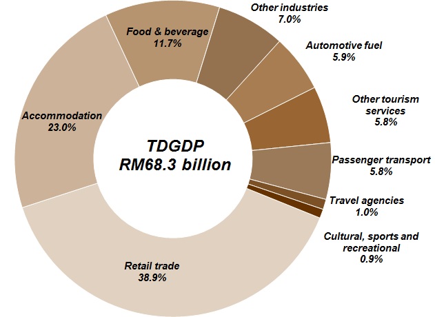 In 2014, the share of Tourism Direct Gross Domestic Product (TDGDP) expanded to 6.2 per cent (2013: 5.9%) of GDP. In terms of value, TDGDP increased to RM68.3 billion from RM60.4 billion (2013) and posted a strong growth of 13.0 per cent as against last year. Retail trade and accommodation were the biggest contributor to TDGDP with a share of 38.9 per cent and 23.0 per cent respectively (Chart 2).