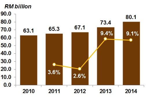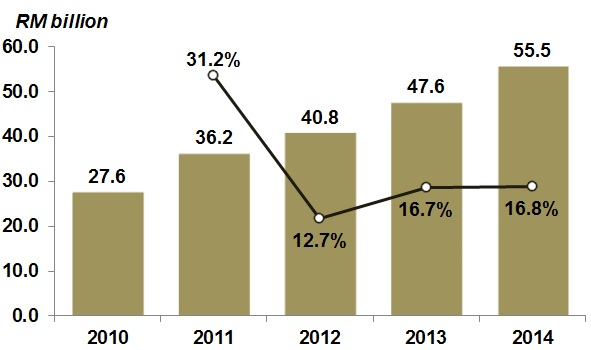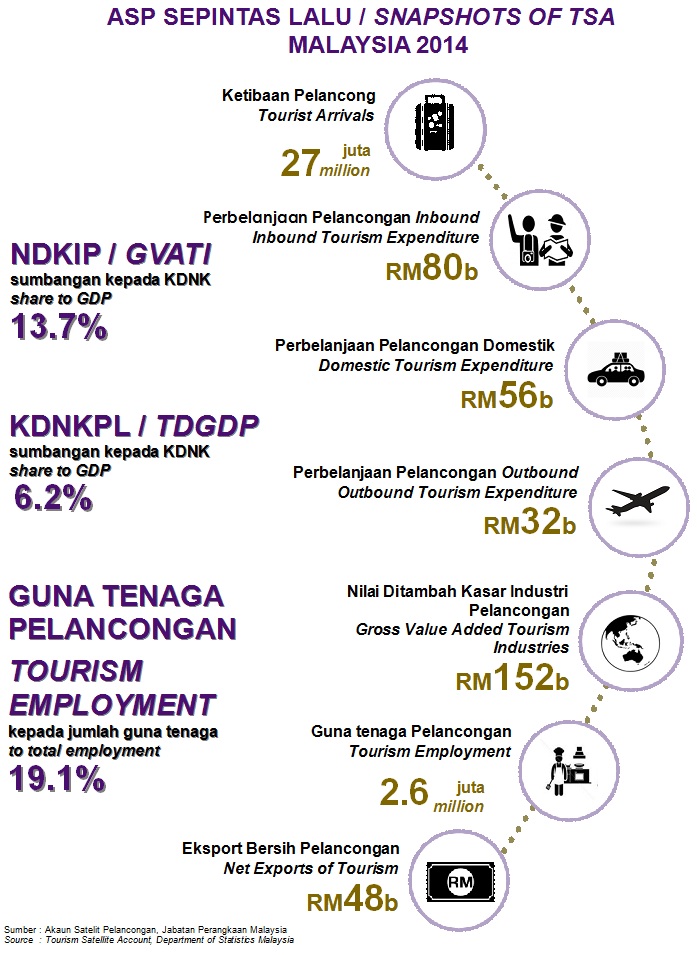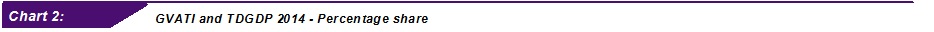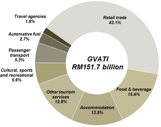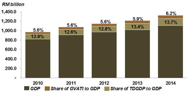 The share of Gross Value Added of Tourism Industries (GVATI) to Gross Domestic Product (GDP) elevated to 13.7 per cent in 2014 as against 13.4 per cent in 2013. GVATI recorded a value of RM151.7 billion with a robust growth of 11.5 per cent (2013: 9.5%) as shown in Chart I. The double-digit growth was impelled by retail trade industry, food & beverage and accommodation.