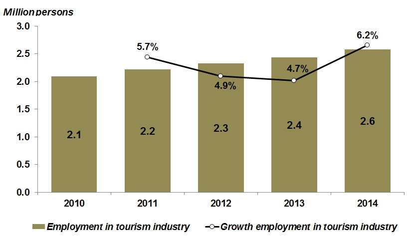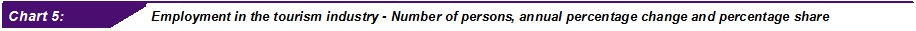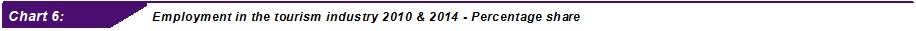 In 2014, employment in the tourism industry grew by 6.2 per cent. This resulted for employment in tourism industry to increase at 19.1 per cent to the total employment (Chart 5).