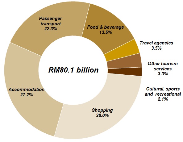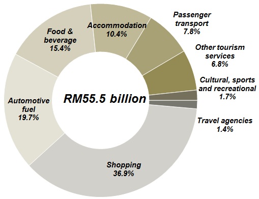 Domestic tourism expenditure continued to register a double-digit growth of 16.8 per cent in 2014 (2013: 16.7%). This performance was propelled by the impressive growth recorded by shopping and retail sale of automotive fuel. In terms of share, shopping remained as the largest component of domestic tourism expenditure and accounted for 36.9 per cent (Chart 4).