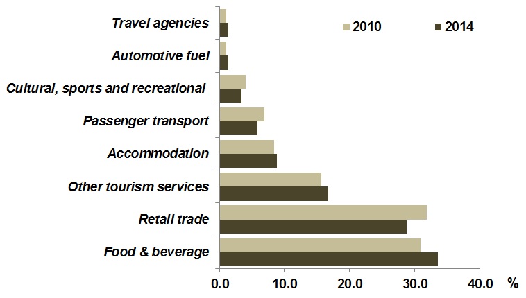 Food & beverage serving services and retail trade recorded the highest employment in the tourism industry with a share of 33.6 per cent and 28.8 per cent respectively (Chart 6).