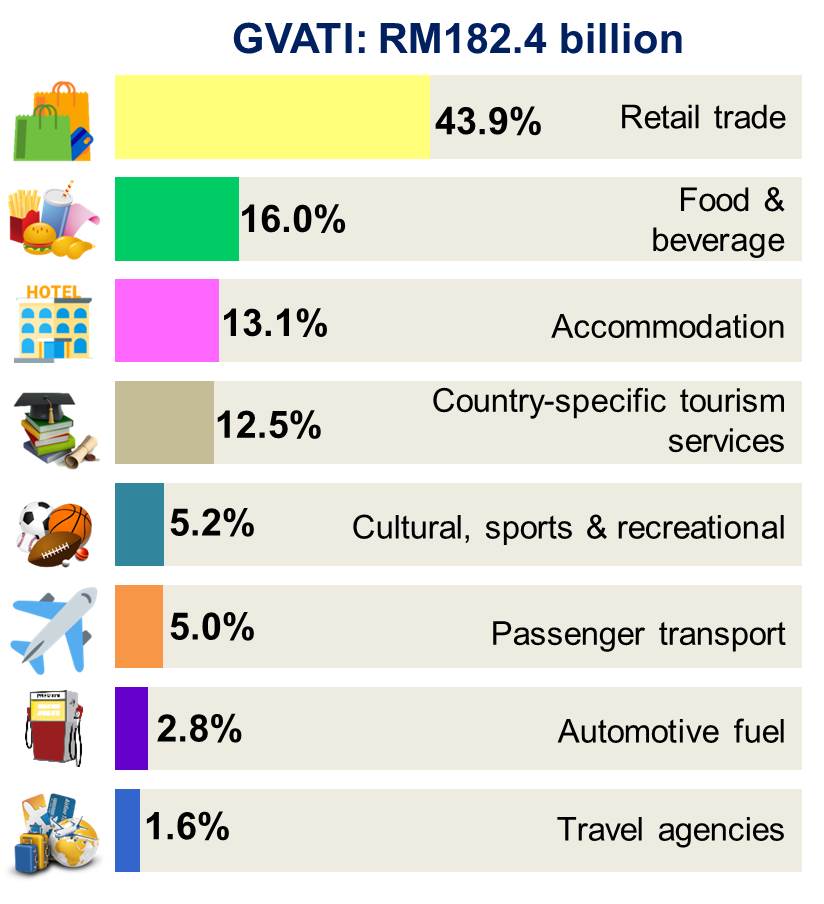 Malaysia’s tourism industry employed 3.2 million persons and contributed 22.7 per cent to total employment. Employment in the tourism industry was attributed by retail trade industry 34.5 per cent and food & beverage serving services 31.2 per cent. Both industries contributed 65.7 per cent to total tourism employment.