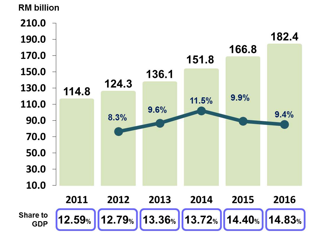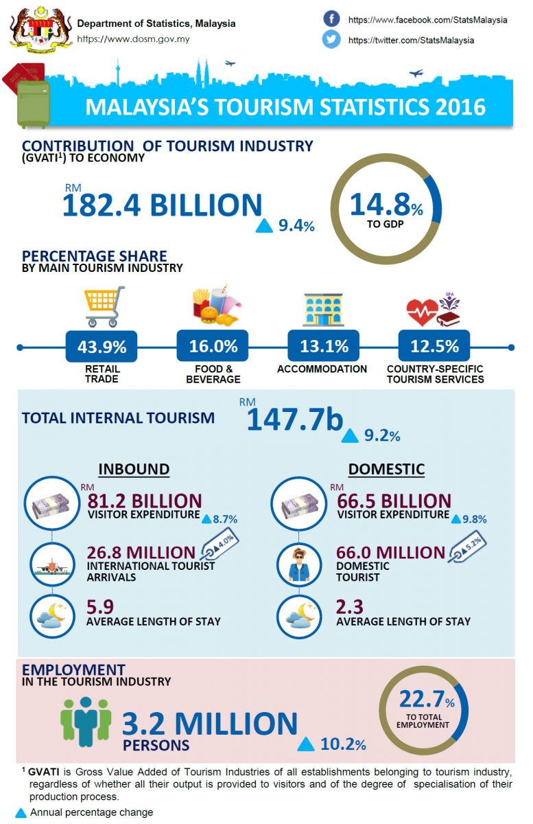 Tourism Industry in Malaysia continues to expand in 2016 with the contribution of 14.8 per cent (RM182.4 billion) to the economy. In terms of growth, Gross Value Added of Tourism Industries grew at 9.4 per cent and the growth was impelled by retail trade industry, food & beverage and accommodation as shown in chart below.