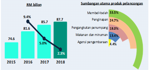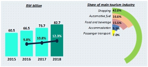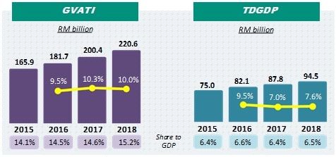 Tourism industry continued to record a better performance in 2018. The share of GVATI to GDP elevated to 15.2 per cent in 2018 as against 14.6 per cent in 2017. GVATI recorded a value of RM220.6 billion, sustained a double-digit growth of 10.0 per cent (2017: 10.3%). This growth was supported by retail trade and food & beverage with a combined share of 63.6 per cent.