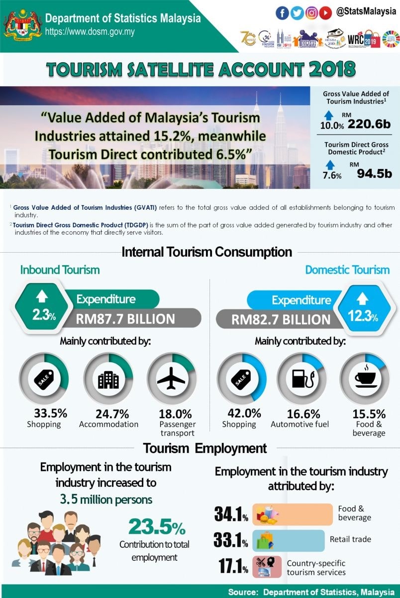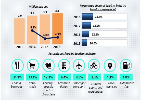 In 2018, employment in the tourism industry grew by 4.9 per cent (3.5 million persons) that contributed 23.5 per cent (2017: 22.9%) to the total employment. Food & beverage serving services and retail trade recorded the highest employment in the tourism industry with a share of 34.1 per cent and 33.1 per cent respectively.