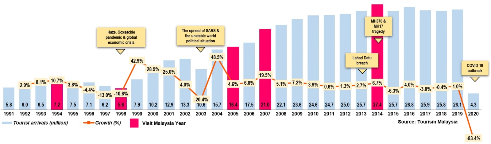 Chart 1: Tourist arrivals in Malaysia, 1991-2020