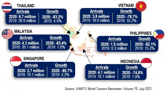 The ASEAN region was also affected by the COVID-19 pandemic. All countries in the region posted negative double-digit growth in the number of tourist arrivals. Singapore showed a declining growth of 85.7 per cent followed by Malaysia and Thailand which decreased by 83.4 per cent and 83.2 per cent respectively (Exhibit 2). |