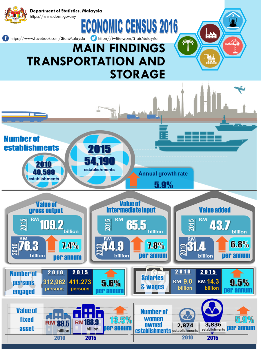 Value of gross output generated for this services amounted to RM109.2 billion. Within the period of 2010 and 2015, there was an increase of RM32.9 billion registering an annual growth of 7.4 per cent per annum. In line with the value of gross output, value added for transportation and storage services recorded an increased of 6.8 per cent per annum with a value of RM43.7 billion.