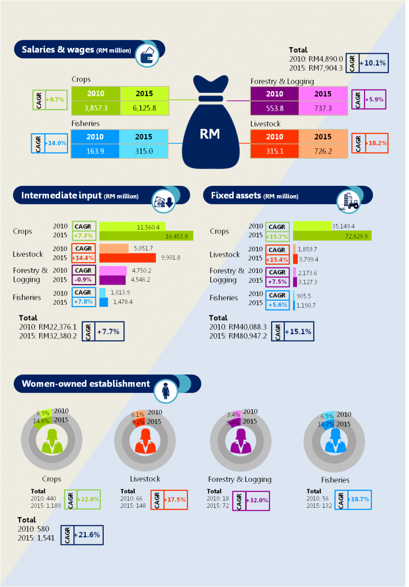 In 2015, number of establishments operating in the agriculture sector was 11,628 establishments with an annual growth of 5.7 per cent. Gross output in 2015 was RM73,853.6 million, an increase of 6.7 per cent per year compared to RM53,452.1 million in 2010 while value added for this sector was RM41,473.4 million.