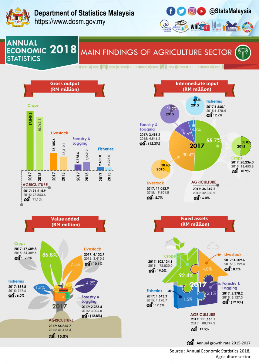 Gross output of agriculture sector in 2017 was RM91.2 billion, an increase of 11.1 per cent per year compared to RM73.9 billion in 2015. Value added for this sector also increased to RM54.9 billion and value of intermediate input also increased by 6.0 per cent per year from RM32.4 billion to RM36.3 billion within the same period.